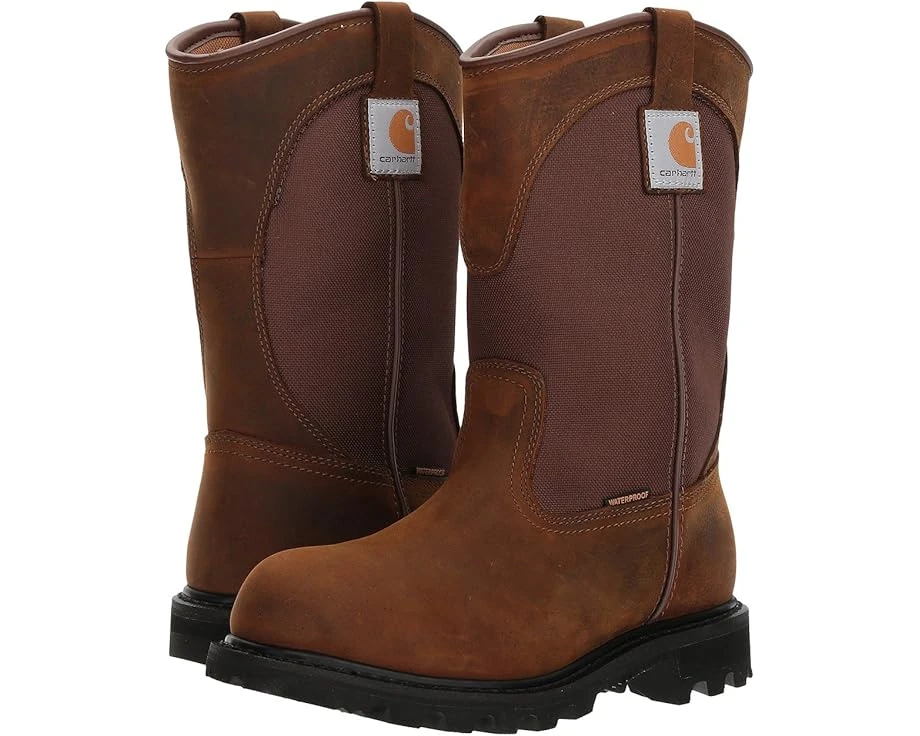 The Carhartt® 10″ Waterproof Wellington Soft Toe work boot provides lasting comfort and weather protection so you can get on with your day and perform at your best. SKU: #9095503Non-safety toe work boot meets ASTM F2892-11 EH (Electrical Hazard) safety standards.Oil tanned leather and abrasion-resistant Cordura nylon upper.Dual-side pulls for an easier on and off. Storm Defender® waterproof membrane keeps feet protected from outside elements. FastDry® technology lining wicks away sweat for comfort and a drier foot environment. Direct-attach welt construction. Cushioned textile insole provides reliable underfoot comfort and support. Dual density PU outsole is slip, oil, and chemical resistant that meets or exceeds the performance requirement set forth by ASTM standard F3445-21. All footwear is labeled as slip resistant on the outsole and the ASTM standard is identified on the inside of the shoe.Imported. Product measurements were taken using size 8.5, width B – Medium. Please note that measurements may vary by size.Weight of footwear is based on a single item, not a pair.Measurements: