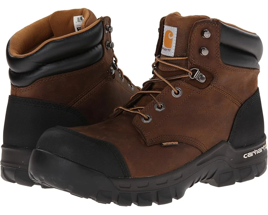 This Carhartt® 6″ Rugged Flex Waterproof Comp Toe Work Boots have the perfect combination of waterproof protection, supportive comfort, and a lightweight composite safety toe so you will always be ready to do some serious work!SKU: #8382479Lace-up work boot with a composite safety toe that meets or exceeds ASTM F2413-18 I/75 C/75 EH (electrical hazard) safety standards.Oiled tan leather upper.Storm Defender® waterproof membrane provides excellent breathability while still keeping out the wet element a drier, more comfortable foot environment. Lace-up closure featuring a six-eyelet design with speed hooks.Padded tongue and collar for added comfort.Rubber heel and toe for extra support and durability.Cement construction provides excellent durability and flexibility.Dual-density OrthoLite® insole provides superior underfoot comfort.EVA Midsole with PU strobel pad for excellent cushioning and shock absorption. Rugged Flex™ outsole is oil and slip resistant that meets or exceeds the performance requirement set forth by ASTM standard F3445-21. All footwear is labeled as slip resistant on the outsole and the ASTM standard is identified on the inside of the shoe. And it features self-cleaning lugs, providing superior traction on difficult and unpredictable terrain. Imported.Product measurements were taken using size 12, width D – Medium. Please note that measurements may vary by size.Measurements: