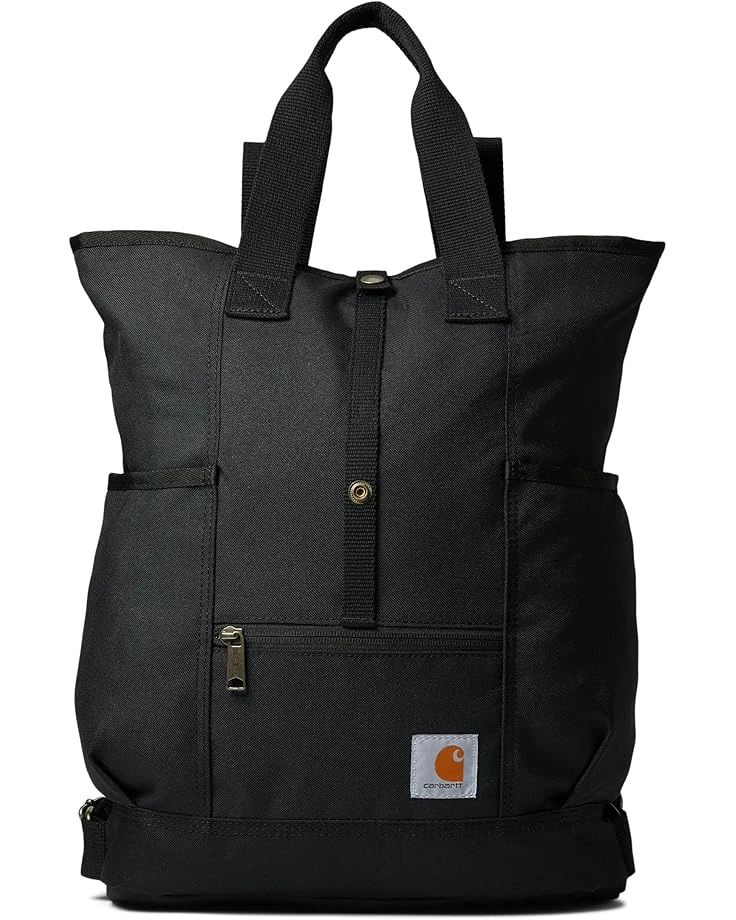 The Carhartt® Convertible Backpack Tote will be your go-to buddy when stepping out and keeps your essentials handy and organized.SKU: #9789261600 Denier polyester construction.Zippered closure.Two top handles and two adjustable shoulder straps.Rain Defender® DWR (durable water repellent) coating keeps your gear dry in light rain.Padded laptop sleeve.Two interior pockets.Two slash pockets on the exterior.Zippered exterior pocket.Convertible design suitable for carrying as a tote bag or backpack.Woven branding patch on the exterior front.Polyester lining.Imported.Measurements: