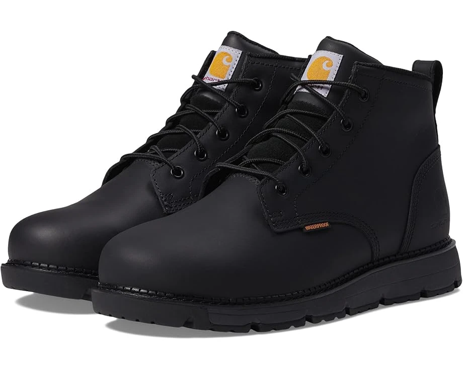 Keep your feet dry and protected on long workdays in the Carhartt® Millbrook Waterproof 5″ Steel Toe Wedge Work Boot.SKU: #9853301Steel safety toe meets ASTM F2413-18 EH (Electrical Hazard) standard.Lace-up closure offers a secure fit.Round toe silhouette.Black oil tanned leather upper.FastDry® lining wicks away sweat and fights odors for a drier, odor-free foot environment. Removable Insite® Footbeds are designed to provide arch support and high rebound cushion for all-day comfort.Carhartt LWD midsole provides elevated lightweight comfort with the expected Carhartt durability.Durable slip-resistant rubber outsole for traction and flexibility with every step.Style Number: FM5204-M (Brown Oil Tanned) FM5201-M (Black Oil Tanned)All Carhartt footwear is tested for slip resistance and meets or exceeds the performance requirement set forth by ASTM standard F3445-21. All footwear is labeled as slip resistant on the outsole and the ASTM standard is identified on the inside of the shoe.Imported.Product measurements were taken using size 9, width D – Medium. Please note that measurements may vary by size.Measurements:
