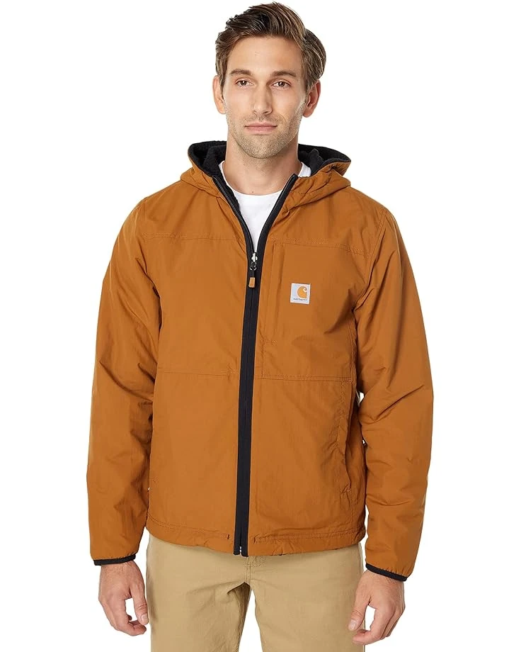 The Carhartt® Rain Defender® Relaxed Fit Fleece Reversible Jacket offers versatility for transitional months. Wear it with the sherpa side out on cool days, and reverse it when the clouds turn grey. The nylon side shrugs off light rain, and it has an extra zipper pocket on the chest.SKU: #9521416Rain Defender® technology keeps you dry and the wet elements out.Center front zipper closure.Adjustable hood with hidden drawcord on nylon side.Fleece side has two lower hand warmer.Nylon side has secure zip left chest pocket.Two secure zipper lower hand pockets.Elastic cuff and adjustable drawcord hem.100% polyester;