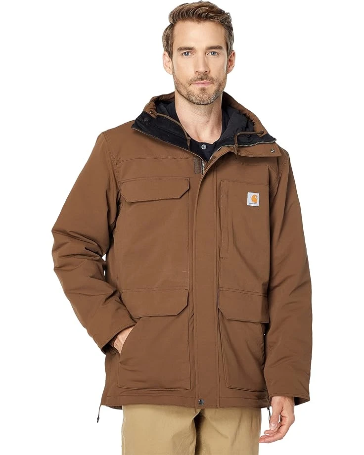 With versatile pocket options and iconic durability, the Carhartt® Super Dux™ Relaxed Fit Insulated Traditional Coat is sure to keep you warm and protected whatever your day has in store. SKU: #9521421Zip-up and hook and loop jacket closure. Attached hood with drawstring. Three front hook and loop flap patch pockets. Zippered chest pocket. Dual front pork chop pockets. Interior patch pocket with hook and loop. Straight hemline with drawstring. Shell: 97% nylon, 3% spandex;