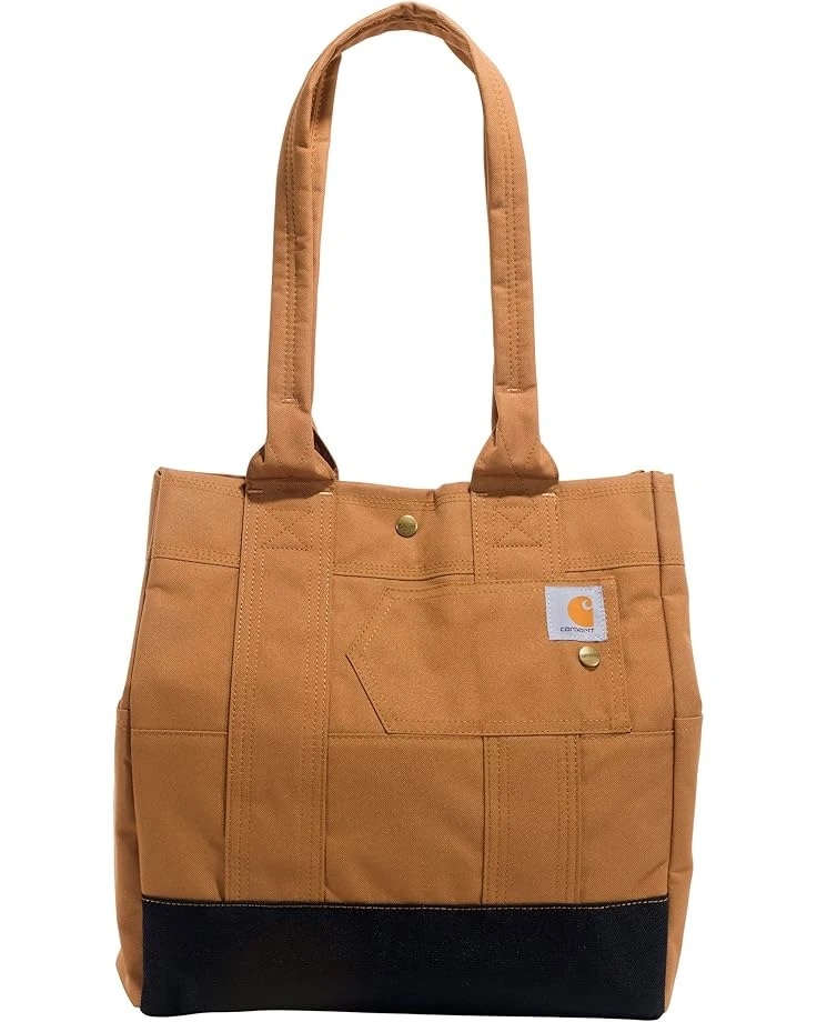 Get convenience as well as style by carrying the Carhartt® Vertical Snap Tote.SKU: #9790159600 Denier polyester with Rain Defender® durable water repellent construction.Large main compartment with snap closure.Interior organizational panel with three pockets. Two exterior pockets.Polyester lining.Measurements: